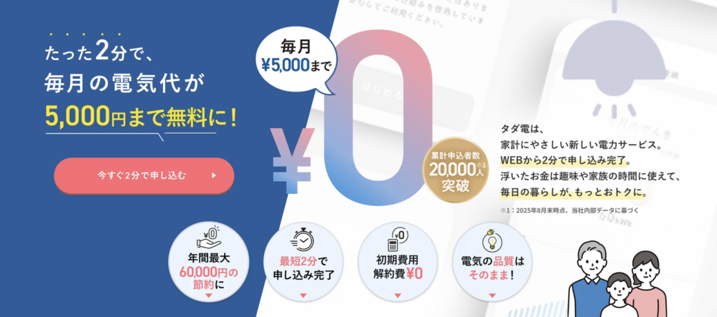 タダ電のルールは極めてシンプルです。**「毎月、電気代が5,000円に達するまでは、請求額は0円」**。 2026年、一人暮らしの平均的な電気代は季節にもよりますが4,000円〜7,000円程度。つまり、タダ電に切り替えるだけで、月の電気代が数百円、あるいは完全に「0円」になる可能性が極めて高いのです。
